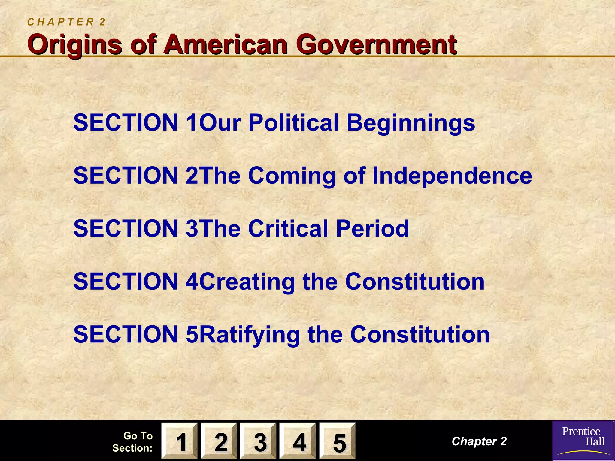 The document summarizes Chapter 2 of Magruder's American Government textbook. Section 1 discusses the origins of American government, including the basic concepts of government brought by English colonists, important English documents that influenced the US system, and the three types of colonies. Section 2 covers the growing colonial unity, the Continental Congresses, American independence, and common features of early state constitutions. Section 3 explains the Articles of Confederation, weaknesses that led to the Critical Period, and calls for a stronger national government. Section 4 describes the Constitutional Convention, different plans debated, compromises reached, and influences on and reactions to the final Constitution. Section 5 discusses the Federalists and Anti-Federalists, the ratification process, and New