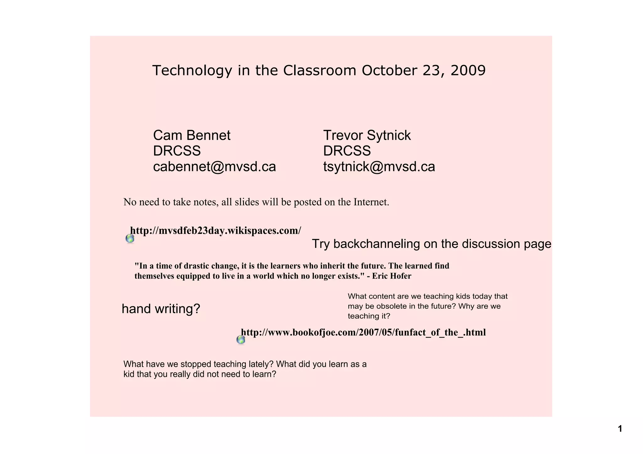 This document provides an agenda and overview of a technology in the classroom presentation on October 23, 2009. The agenda covers introductory presentations on various classroom technologies from 9:00-12:00 and 1:00-2:30, with coffee breaks in between. Technologies discussed include Smartboards, podcasting, blogs, social networking, clickers, and online testing and notes. The document also shares a student survey on the use of classroom technology and ideas for finding more technology integration resources and examples online.