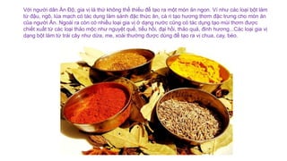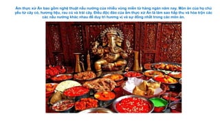 Ẩm thực Ấn Độ là sự hòa trộn đa dạng các món ăn từ nhiều vùng miền, chủ yếu sử dụng gia vị phong phú và các nguyên liệu tự nhiên. Trong đó, cà ri và bánh naan là hai món đặc trưng, với cà ri có nhiều loại và bánh naan phục vụ cho bữa ăn hàng ngày. Người Ấn cũng ưa chuộng các món nướng như gà tandoori và đồ uống giải nhiệt truyền thống là lassi.