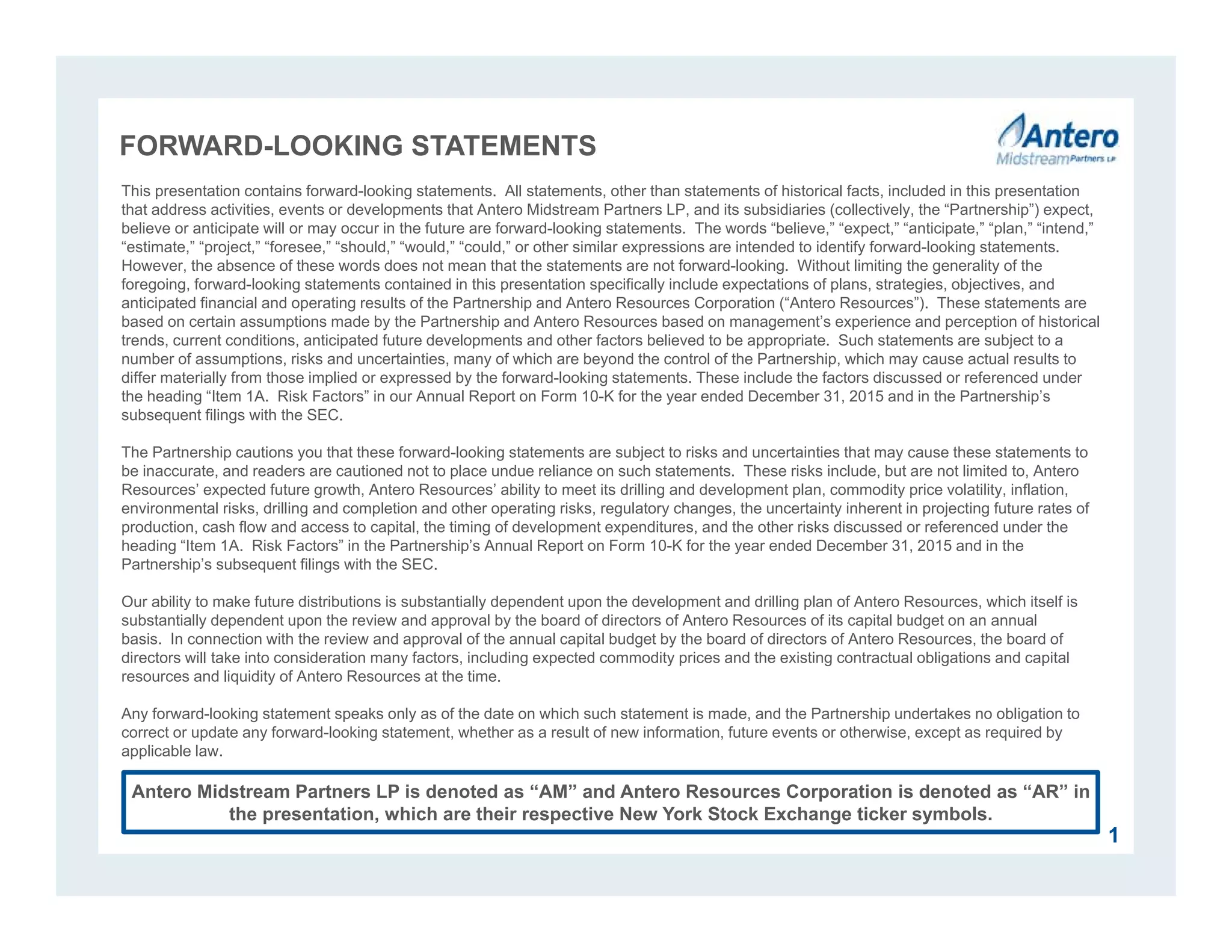 The document provides an overview of Antero Midstream Partners LP and contains forward-looking statements regarding future plans and expectations. It discusses key assumptions and risks, including commodity price volatility. It also notes that Antero Resources' annual development plan and board approval are important to Antero Midstream's ability to make future distributions. The document contains information on Antero Midstream and Antero Resources' acreage positions, reserves, production, and well economics as of December 31, 2015.