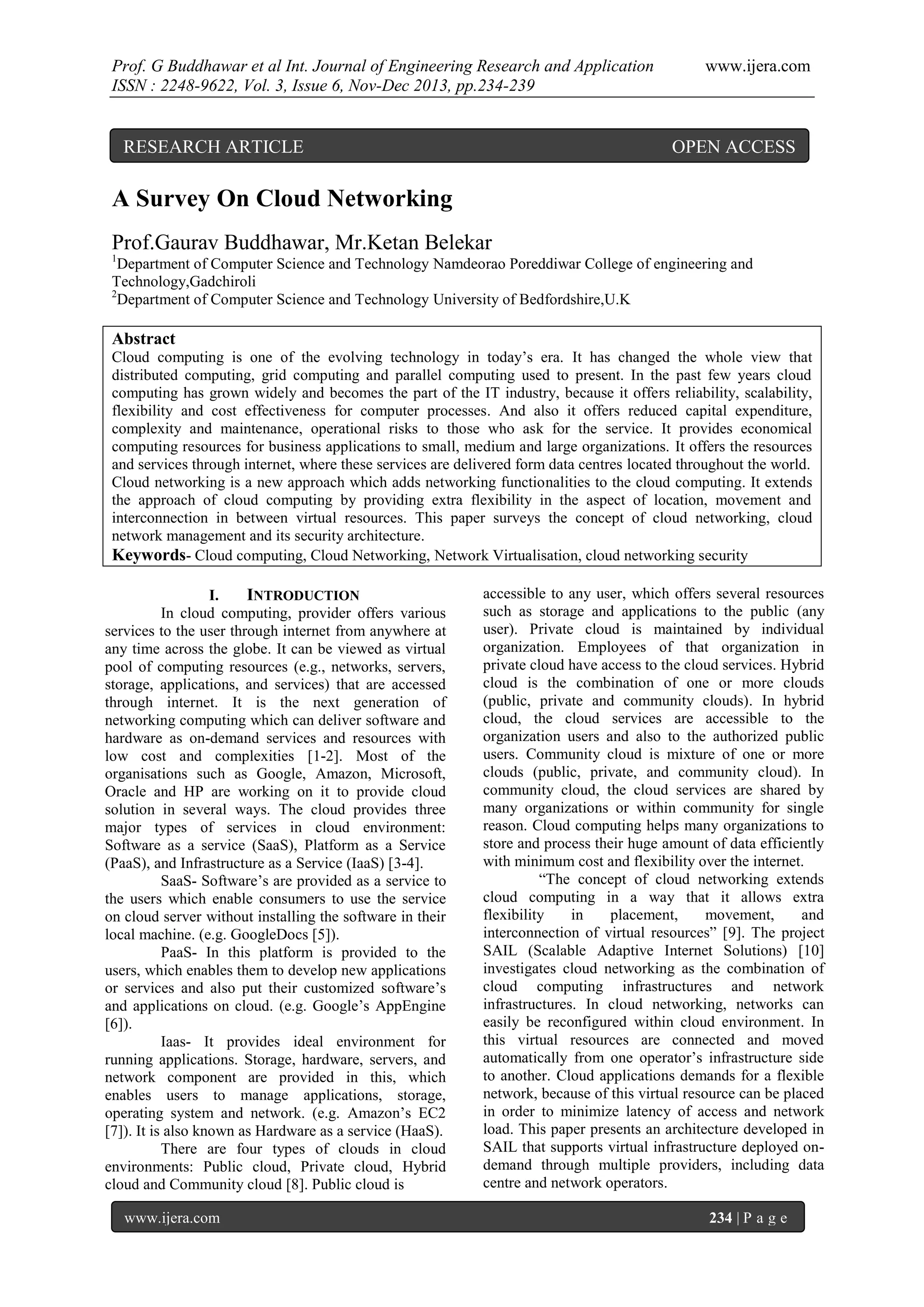 This research article surveys cloud networking, emphasizing its role as a progression from cloud computing to provide enhanced flexibility in managing virtual resources. It discusses key concepts such as virtualization, cloud service types (SaaS, PaaS, IaaS), and various cloud models (public, private, hybrid, community). The paper also covers cloud networking architecture and its management, addressing challenges in security, resource allocation, and performance optimization.