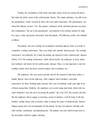 This document summarizes a pilot study on cardiovascular disease management for employees. The study examined employees who had been diagnosed with high blood pressure or high cholesterol. Lifestyle questionnaires assessed their diet, exercise, and stress levels. The results found that employees exposed to competitive or high-stress work environments had higher blood pressure and glucose levels. Recommendations included employers providing a healthier work environment with less stress, employees eating less junk food and cholesterol, engaging in regular exercise, and participating in support groups. The goal of the pilot study was to provide guidelines to help patients achieve a healthier lifestyle and reduce risk factors for cardiovascular disease.