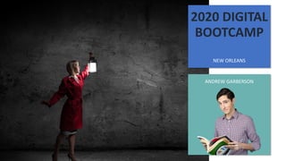 This document outlines an agenda for a 2020 digital bootcamp in New Orleans. It covers various digital marketing topics like earned, owned and paid channels; funnel metrics like visits, leads, and customers; and strategies for the top, middle and bottom of the funnel. It also includes sections on marketing basics, audience design, analytics, search engine marketing, search engine optimization, and conversion optimization. The final pages provide information on marketing yourself and measuring marketing performance.