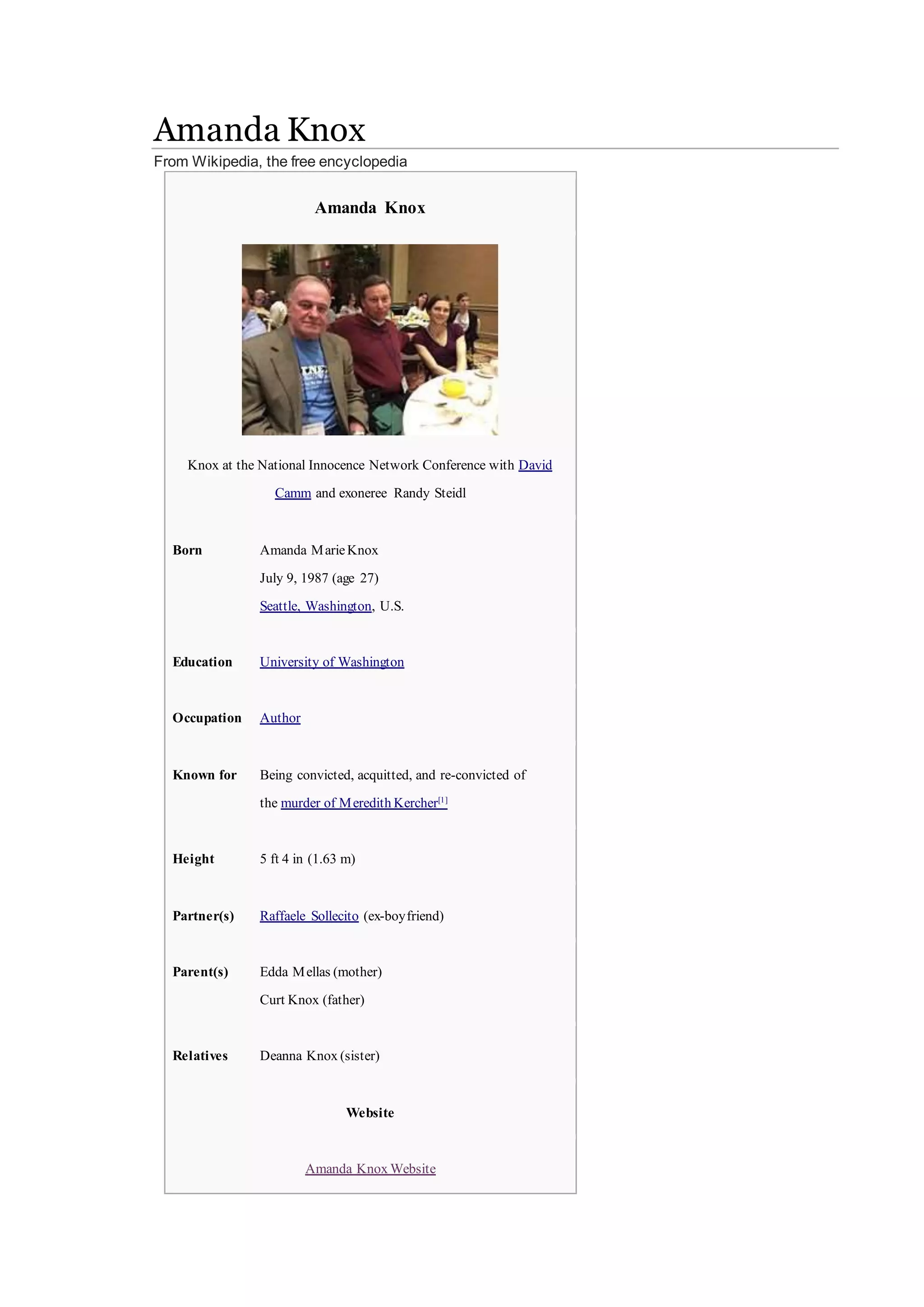 Amanda Knox is a U.S. woman born in 1987, whose conviction for the 2007 murder of Meredith Kercher in Italy was widely publicized and controversial. Initially convicted and later acquitted, Knox was again found guilty in 2014 but both she and her co-defendant Raffaele Sollecito remain free due to the Italian legal system's appeals process. The case raised significant questions about the reliability of evidence and the conduct of the Italian judicial system.