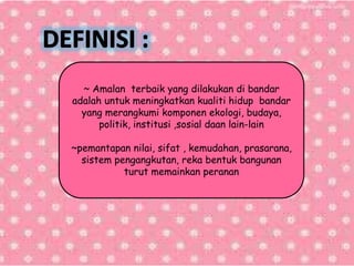 Dokumen ini membincangkan amalan terbaik di bandar untuk meningkatkan kualiti hidup, termasuk pengurusan sampah yang sistematik di Jepun dan sikap hormat warganya. Contoh lain termasuk bantuan cepat kepada mangsa banjir di Pahang dan aktiviti berbuka puasa secara berjemaah. Amalan baik dari setiap negara dapat dijadikan contoh untuk meningkatkan masyarakat.