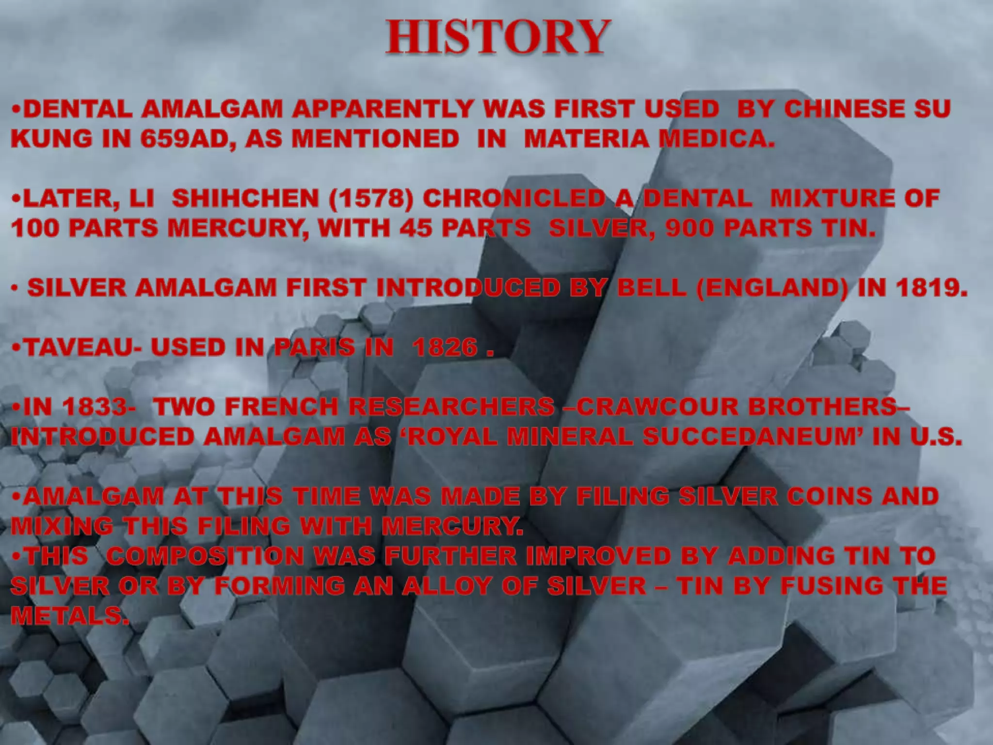 This document discusses the history and composition of dental amalgam. It describes the three "amalgam wars" where the safety of amalgam was debated. Amalgam is an alloy of silver, tin, copper and sometimes other metals like zinc. The document outlines the different generations of amalgam alloys and how composition affects properties. High copper alloys aim to improve strength and corrosion resistance over traditional low copper alloys. Both admixed and unicompositional high copper alloys are discussed in terms of their microstructure and reaction with mercury during setting. The physical properties of dimensional stability, strength and corrosion resistance are also summarized.