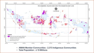 This document provides an agenda and details about ALIANSI MASYARAKAT ADAT NUSANTARA (AMAN) which will take place from March 13-19. The agenda includes discussions on indigenous youth leadership, infrastructure, culture, land planning, and access to funding. It also notes that over 2,300 indigenous communities and 19 million people are represented by AMAN. It provides statistics on AMAN's regional chapters and recognized indigenous territories and lands in Indonesia.