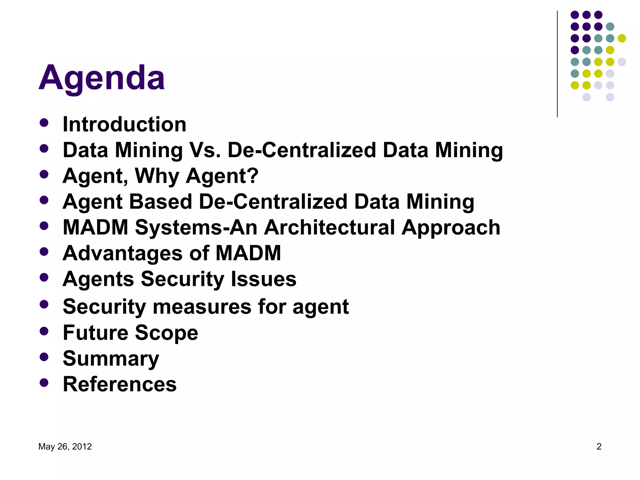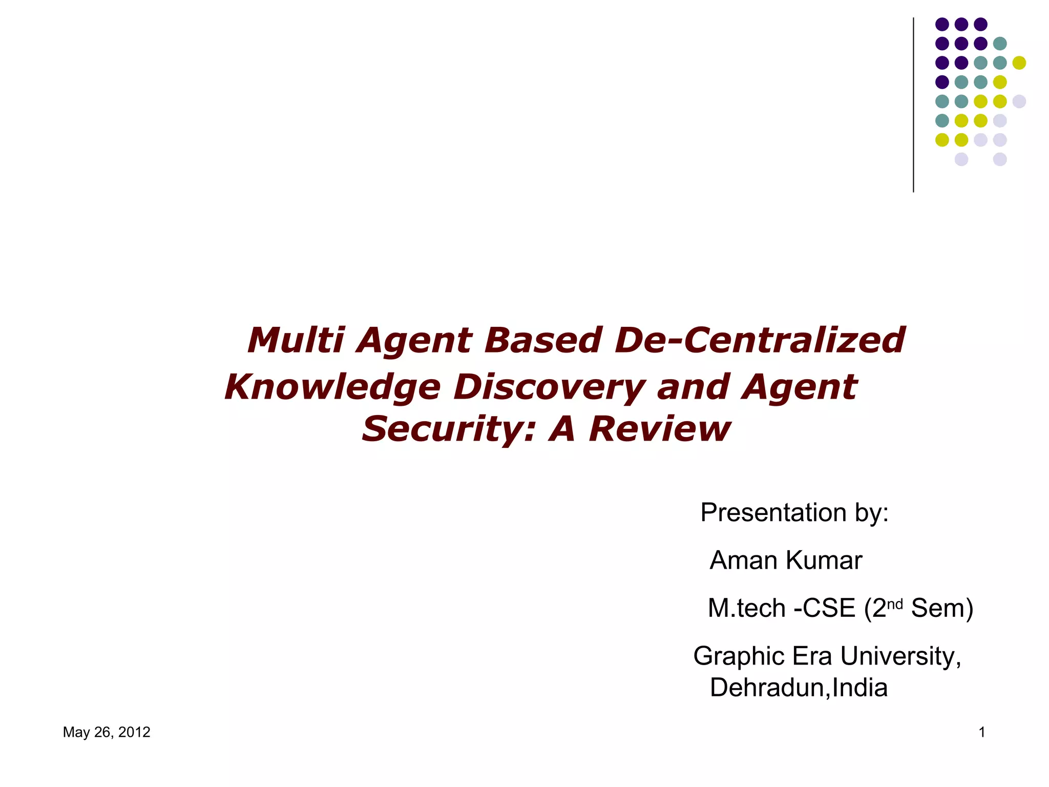 The document presents an overview of multi-agent based decentralized knowledge discovery and agent security. It discusses data mining versus decentralized data mining and the use of agents for distributed data mining. It describes the basic components of agent-based distributed data mining systems including the application layer, data mining layer, and agent grid infrastructure layer. It also discusses multi-agent distributed data mining systems, the roles of different agent types, security issues for agents, and measures to secure agents. Finally, it outlines potential future applications and provides references for further reading.