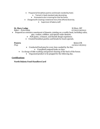 Amanda Patton has a certificate in patisserie and baking from Le Cordon Bleu College of Culinary Arts. She has worked in various roles such as a cook, baker, and prep worker for establishments including Magic City Daycare, The Wellington, Baker Boy, Hyatt Regency Saipan, St. Mary Lodge, and Panera. Her objective is to advance her career in a stimulating environment while helping the company succeed.