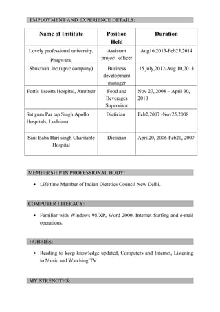 Amandeep Kaur Chahal's curriculum vitae summarizes her career and qualifications. She has over 10 years of experience as a dietician, having worked at several hospitals in Punjab. She holds an MBA in operations management from Lovely Professional University and a postgraduate diploma in nutrition and dietetics. Currently, she runs her own clinic in Phagwara and seeks to excel in her field as a dietician.
