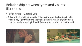 This document summarizes different types of relationships between lyrics and visuals in music videos, including illustrations, amplifications, and contradictions. It also discusses intertextual references, iconography, voyeurism, and how music videos can focus on the star persona. Specific music videos are analyzed as examples, such as Girls Like Girls by Hayley Kiyoko illustrating the lyrics and Pity Party by Melanie Martinez amplifying the lyrics through more extreme visuals.