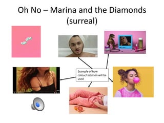 The document provides descriptions for potential music videos to illustrate relationships between song lyrics and visuals. It outlines four music video concepts, describing each as surreal, narrative, or parody in tone. Details include locations, camera techniques, character movements, and how the visuals would connect to and enhance the themes in the song's lyrics.