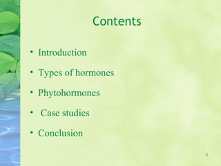 The document discusses plant growth regulators and their role in crop improvement. It begins by introducing plant hormones and the five major classes: auxins, gibberellins, cytokinins, abscisic acid, and ethylene. It then examines each hormone in more detail, describing their discovery, functions, effects on growth, and practical applications in agriculture. Specific examples are provided such as how auxins promote cell elongation and apical dominance, gibberellins induce stem elongation and seed germination, and ethylene stimulates fruit ripening and senescence. In conclusion, plant growth regulators are important for plant growth and development and widely used to improve crop yields and quality.