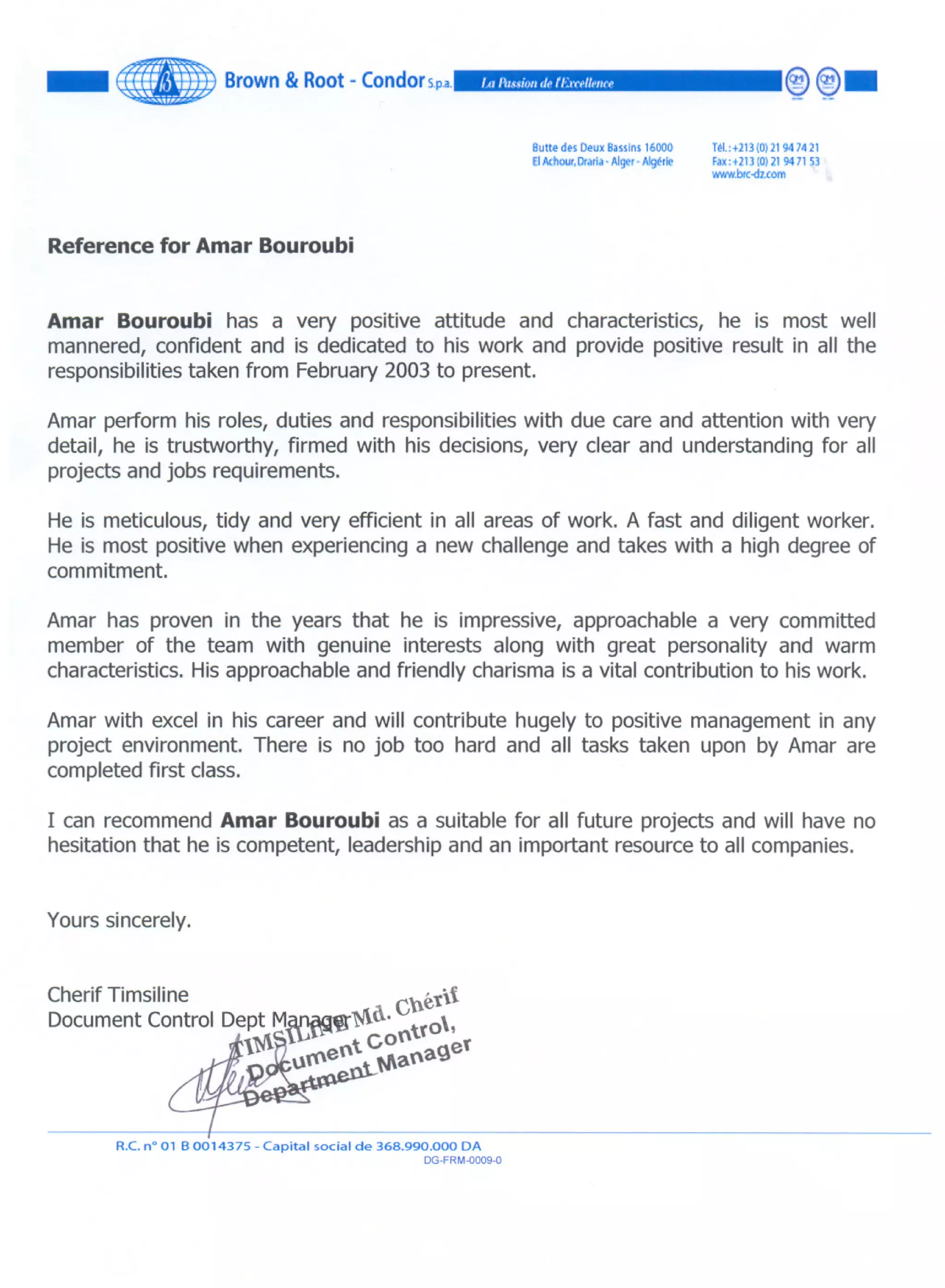 Amar Bouroubi is highly recommended for future projects based on his positive work attitude and characteristics. He performs his roles and responsibilities with care, attention to detail, and delivers positive results. Amar is trustworthy, makes firm decisions, understands project requirements clearly, and is meticulous, tidy, and efficient. He approaches new challenges with commitment and is an approachable, committed team member with a warm personality. There is no task too hard for Amar, as he completes all work first class. He will excel in his career and contribute hugely to positive management in any project environment.