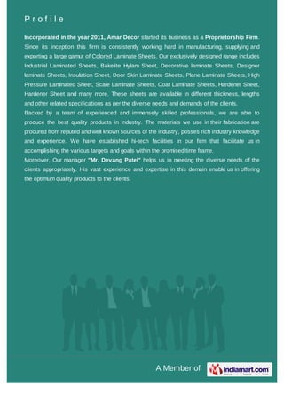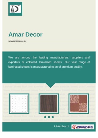Amar Decor is a leading manufacturer, supplier, and exporter of a wide range of laminated sheets, including industrial, decorative, designer, and door skin laminate sheets. Established in 2011, the company prides itself on high-quality products and extensive industry knowledge, with a focus on meeting diverse client needs. The firm ensures timely delivery and superior quality through a skilled team and advanced facilities.