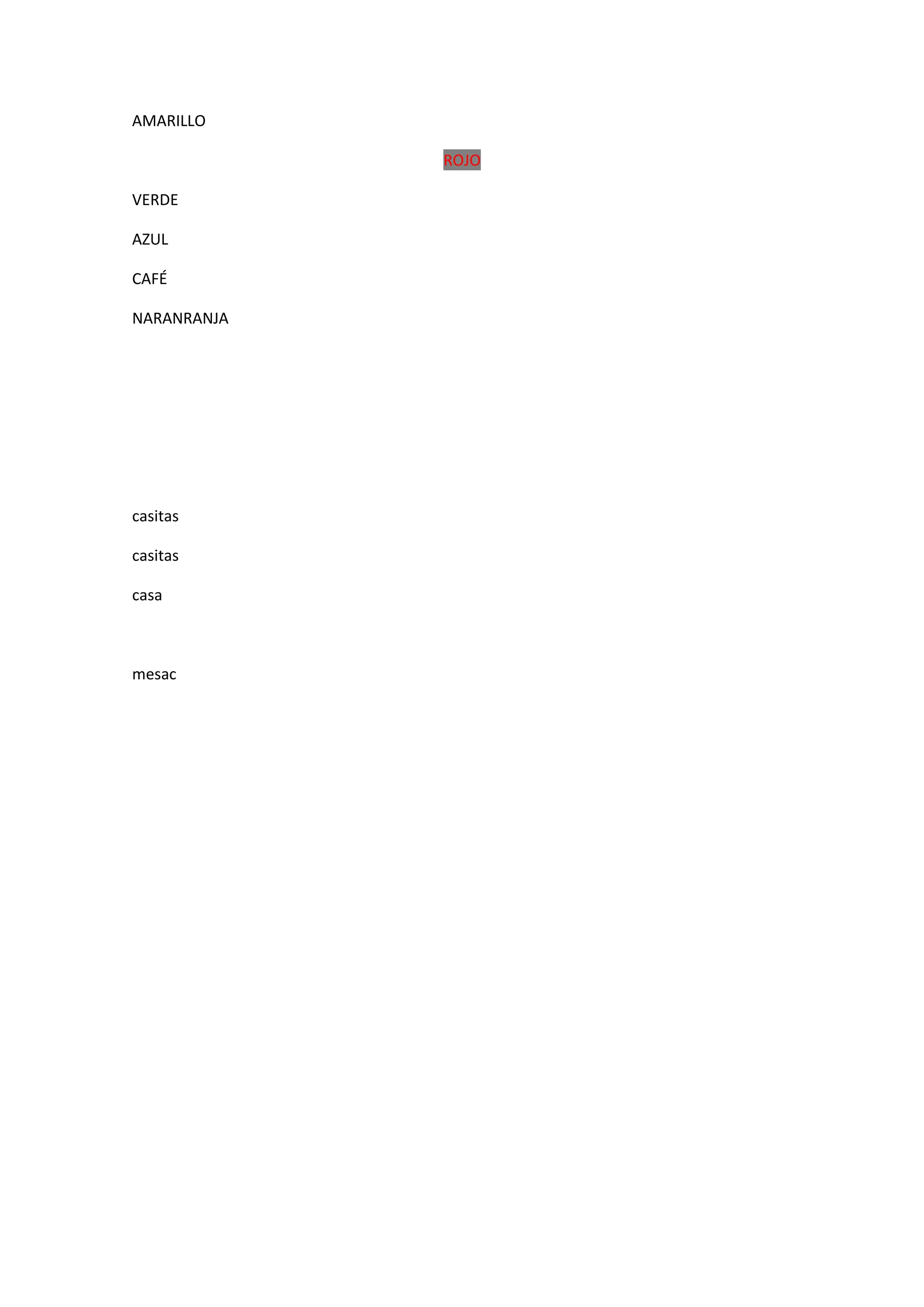 The document lists different colors in Spanish - yellow, red, green, blue, brown, and orange. It then repeats listings of these colors multiple times, along with listings of Spanish words for small houses, tables, and houses. Random letters and symbols are included at the end.