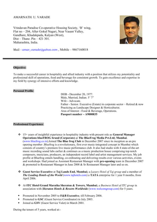 Amarnath Varade is seeking a position in hospitality and allied industries that utilizes his 15+ years of experience in operations, food and beverage, and consistent growth. He has worked in various roles at prestigious hotels like Taj Lands End, ITC Grand Maratha Sheraton, and The Orchid, and is currently the General Manager Operations at BlueFrog Media Pvt. Ltd. He has expertise in operations management, budgeting, training, and ensuring smooth operations for over 1900 live music performances. He is computer literate and holds various certifications in hospitality.