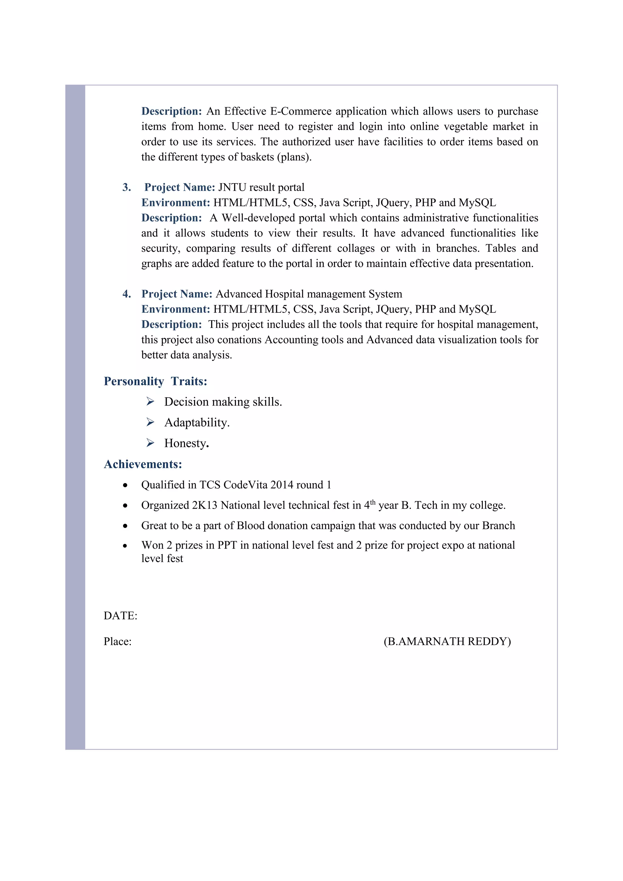 B. Amarnath Reddy is pursuing a Masters in Information Technology from Jawaharlal Nehru Technological University Anantapur with a focus on information security. He has skills in languages like C and Java as well as web technologies such as HTML, CSS, JavaScript, JQuery, Servlets, and PHP. Some of his academic projects include a mini Google search engine built with Java swings, an online vegetable market using HTML, JavaScript and MySQL, a JNTU results portal using PHP and MySQL, and an advanced hospital management system. He aims to grow professionally while contributing positively to an organization and has strengths in decision making, adaptability, and honesty.
