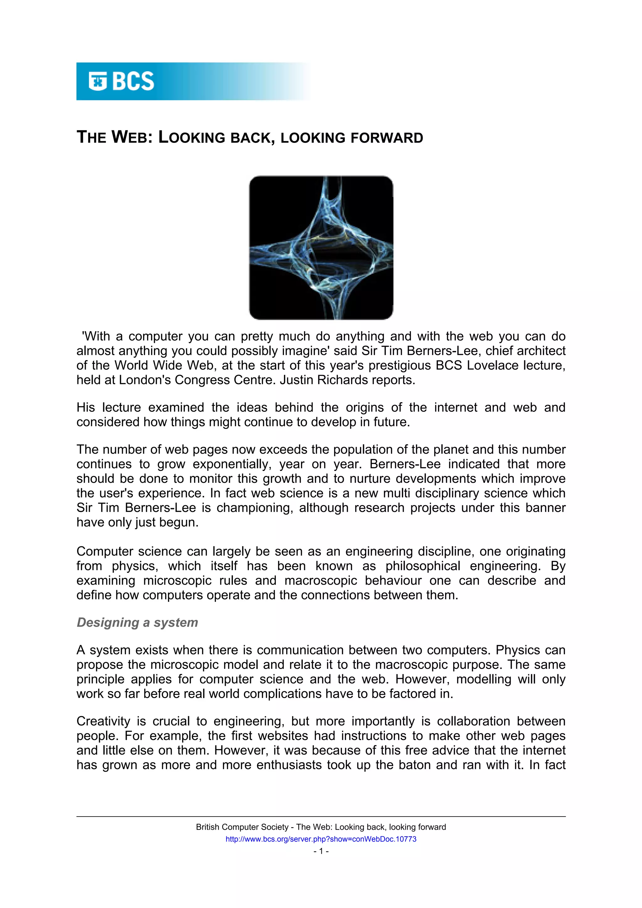 Sir Tim Berners-Lee, who invented the World Wide Web, gave a lecture examining its origins and future development. He discussed how the number of web pages now exceeds the world's population and continues growing exponentially each year. Web science is championed by Berners-Lee as a new field to better understand this growth and improve the user experience. He also emphasized that the web's success is largely due to collaboration and creativity between its users.