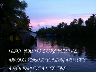 The document advertises an amazing Kerala holiday trip for November 2011, promoting the beautiful scenery, cultural experiences, and relaxing activities that will provide a holiday of a lifetime. It describes opportunities to visit wildlife areas and interact with elephants, experience cultural shows, relax on houseboats and beaches, get Ayurvedic massages, see tea plantations in Munnar, and enjoy included excursions like elephant rides and tours. The trip caters to mature citizens and promises great value through direct negotiations without middlemen. Complimentary activities are also being offered on this November tour. Inquiries are directed to the provided contact details.