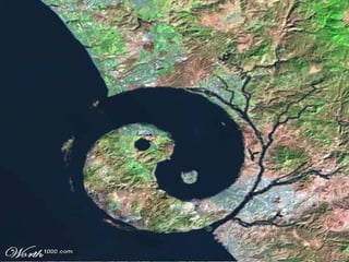 The document presents a collection of images that appear to show faces, figures, and objects that some may claim are evidence of prehistoric giants, aliens, or advanced ancient civilizations. These include photos of landscapes and geological formations that resemble a man's face, a horse emerging from water, a gun or gas pump, and a woman lying on her back, among other apparent figures. The document suggests these formations may have been artificially carved, though some appear to have formed naturally, and their origins are ambiguous.