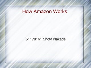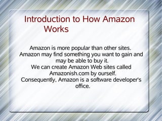 Amazon is a popular online retailer that allows customers to find and purchase a wide variety of products. It uses Linux-based technology to manage queries, historical data, and load information into its systems. Early on, Amazon introduced secure payment processing to allow customers to shop safely online. The company aims to be the most customer-centric retailer by helping people find anything they want to buy, but achieving that goal is challenging. Amazon has advantages like low costs, marketing support for other websites, and a free platform for other sellers.