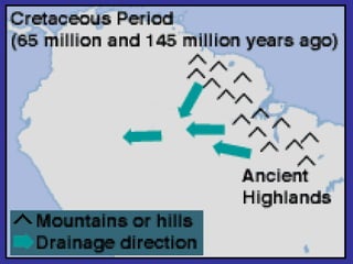 1) Around 150 million years ago, South America and Africa were joined as part of the supercontinent Gondwanaland, with water flowing west into the Pacific Ocean.