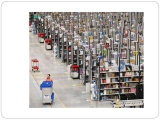This document analyzes Amazon's supply chain at different levels and discusses key aspects of its operations. It notes that Amazon has around 50 warehouses globally, including 20 in the US, to fulfill orders quickly. The document also discusses Amazon's multi-tier inventory model that allows for very low fixed costs. Questions and answers are provided that discuss advantages of online sales over traditional retail, how brick-and-mortar stores can benefit from online sales, and which products are better suited for online versus retail sales.