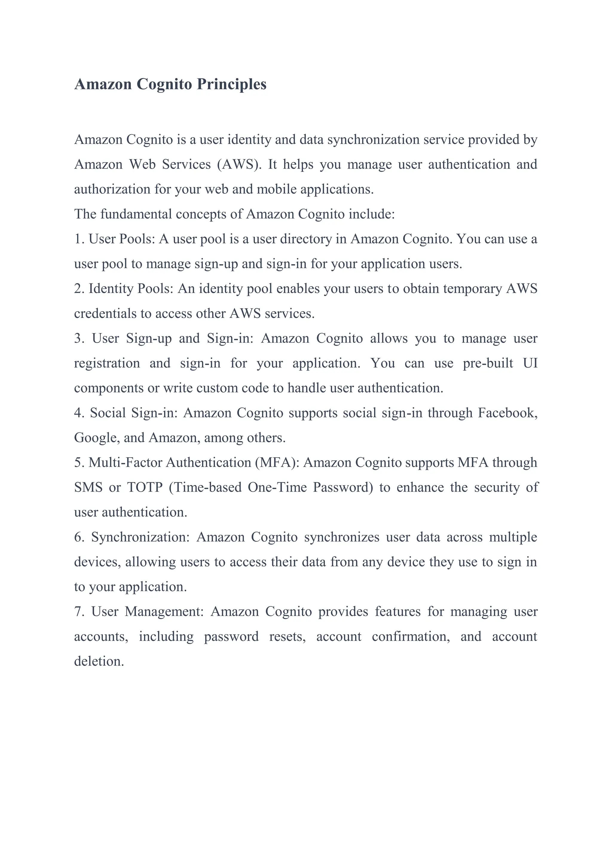 Amazon Cognito is a user identity and data synchronization service provided by AWS that helps manage user authentication and authorization for web and mobile applications. It includes user pools for user directories, identity pools for temporary AWS credentials, and features for user sign-up, sign-in, social sign-in, multi-factor authentication, data synchronization, and user management. An example scenario describes a company using these Amazon Cognito features to build a mobile app for customers to order products and track deliveries.