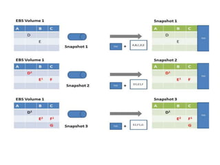 EBS provides persistent block level storage volumes for EC2 instances that can be mounted, remain persistent after an instance is terminated, and backed up via incremental snapshots stored cost-effectively in S3. SimpleDB provides a non-SQL database for simple structured data storage without schemas in domains/tables with items/rows and attributes/columns, supporting multiple values per cell. It is aimed at small amounts of metadata management.