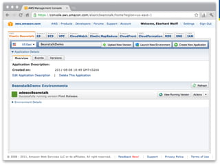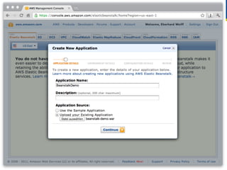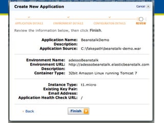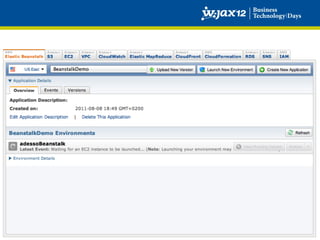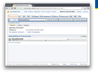 Amazon Elastic Beanstalk provides a platform for deploying and scaling web applications easily on AWS. It automatically handles the deployment, capacity provisioning, load balancing, auto-scaling, and application health monitoring of applications hosted on AWS. It supports popular programming languages such as Java, PHP, Python and .NET and integrates with other AWS services including EC2, S3, RDS and DynamoDB. It allows deploying applications easily via a web console or API and handles tasks such as provisioning servers, load balancing, automatic scaling and application health monitoring.
