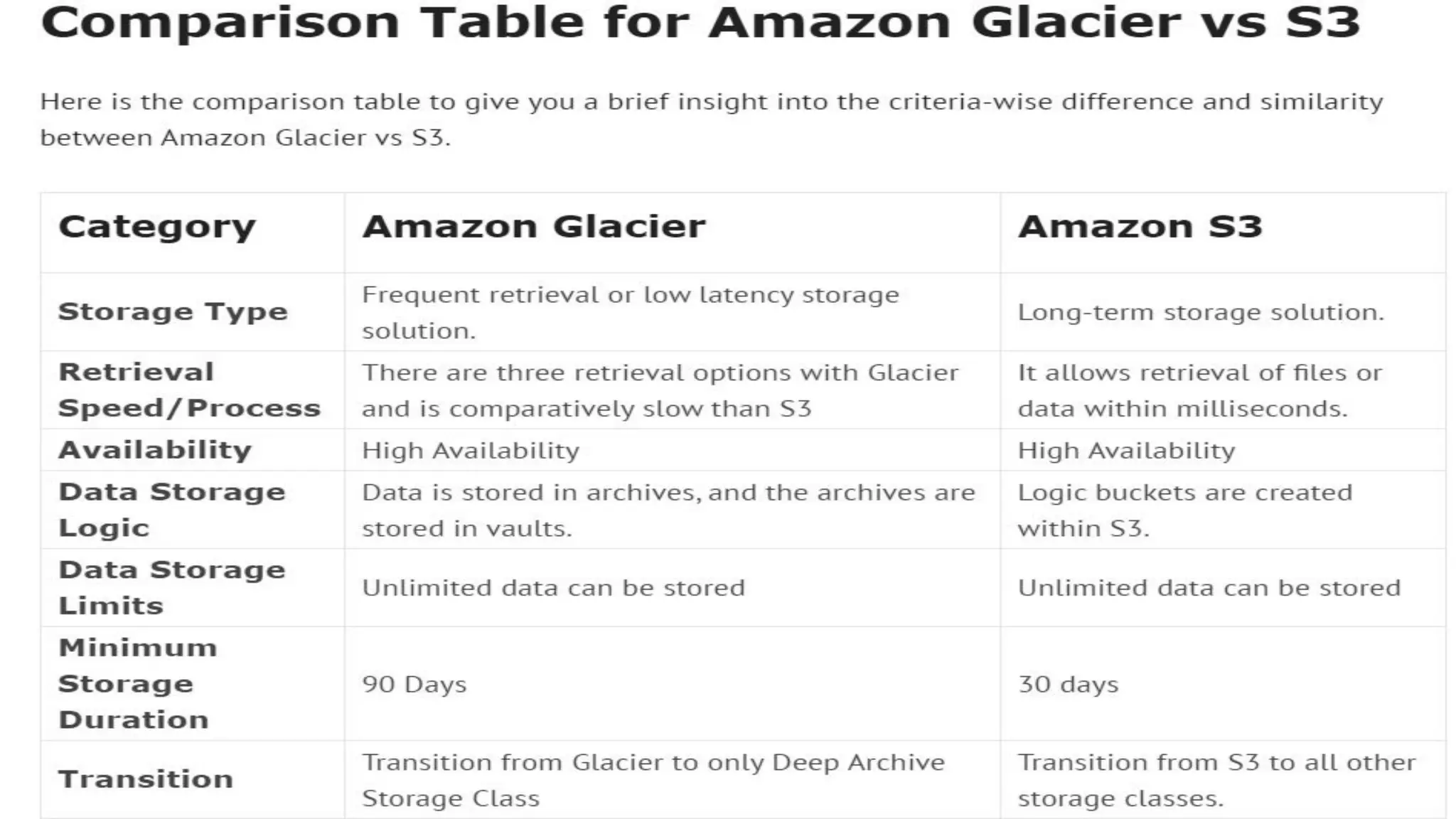 Amazon Glacier and Amazon S3 are both storage solutions offered by AWS, with Glacier focusing on long-term data archiving and S3 on frequent data access. Glacier provides managed storage with low costs for infrequently accessed data, while S3 allows unlimited data storage and retrieval without location barriers. Organizations often use both services together, utilizing S3 for immediate access and transitioning older data to Glacier for long-term retention.