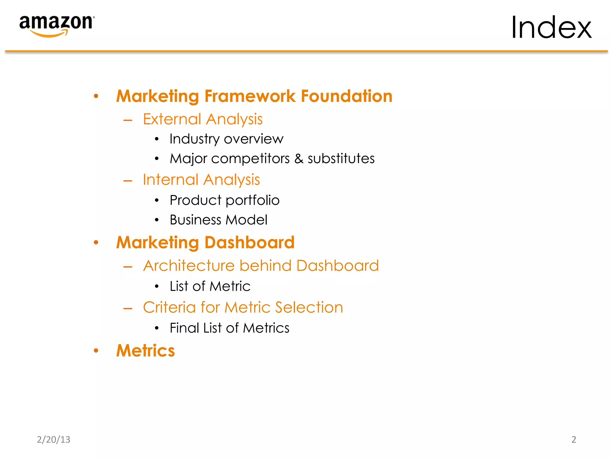 This document discusses Amazon's marketing framework, including their external and internal analysis. It provides an overview of Amazon's history and industry, as well as their major competitors and market share. Metrics that Amazon tracks are also listed, such as purchase habits, clickthrough rate, loyalty, and return on sales. The document outlines Amazon's strengths in supply chain management and customer base, as well as weaknesses in customer service and additional shipping costs. It analyzes opportunities for Amazon to expand product categories and threats from competing online retailers and streaming services.