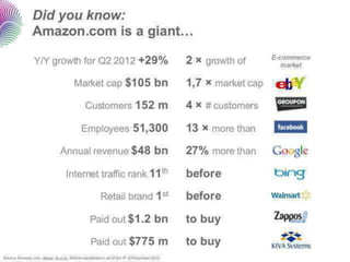 1. Amazon started in 1995 as an online bookstore and has since expanded into various product categories like electronics, fashion, toys, and home goods. It has grown to be one of the largest online retailers in the world.