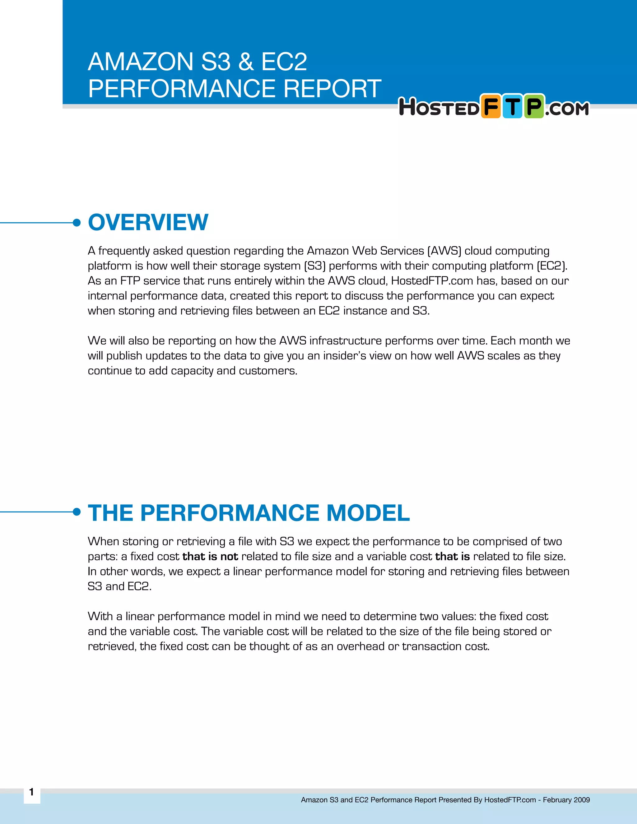 The Amazon S3 and EC2 Performance Report by hostedftp.com analyzes the performance of file storage and retrieval in AWS, noting a linear performance model with a fixed cost of approximately 140 ms for storing, while retrieval shows negligible fixed costs. Data collected from 50,000 operations indicates variable transfer rates between 10 and 12 MB/s for both storing and retrieving files. The report aims to provide ongoing updates on AWS performance as capacity and user demand grow.