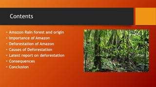 The document discusses the Amazon rainforest, including its importance, causes of deforestation, and consequences. The largest rainforest in the world, over half of it is located in Brazil and home to over 30 million people from 350 ethnic groups. It plays a key role in regulating oxygen and carbon cycles, producing 6% of the world's oxygen. Deforestation has increased over the last 50 years due to agriculture, cattle farming, and infrastructure development. This results in higher carbon dioxide levels and loss of biodiversity, threatening the planet. While organizations work to address it, illegal activities remain difficult to fully address.