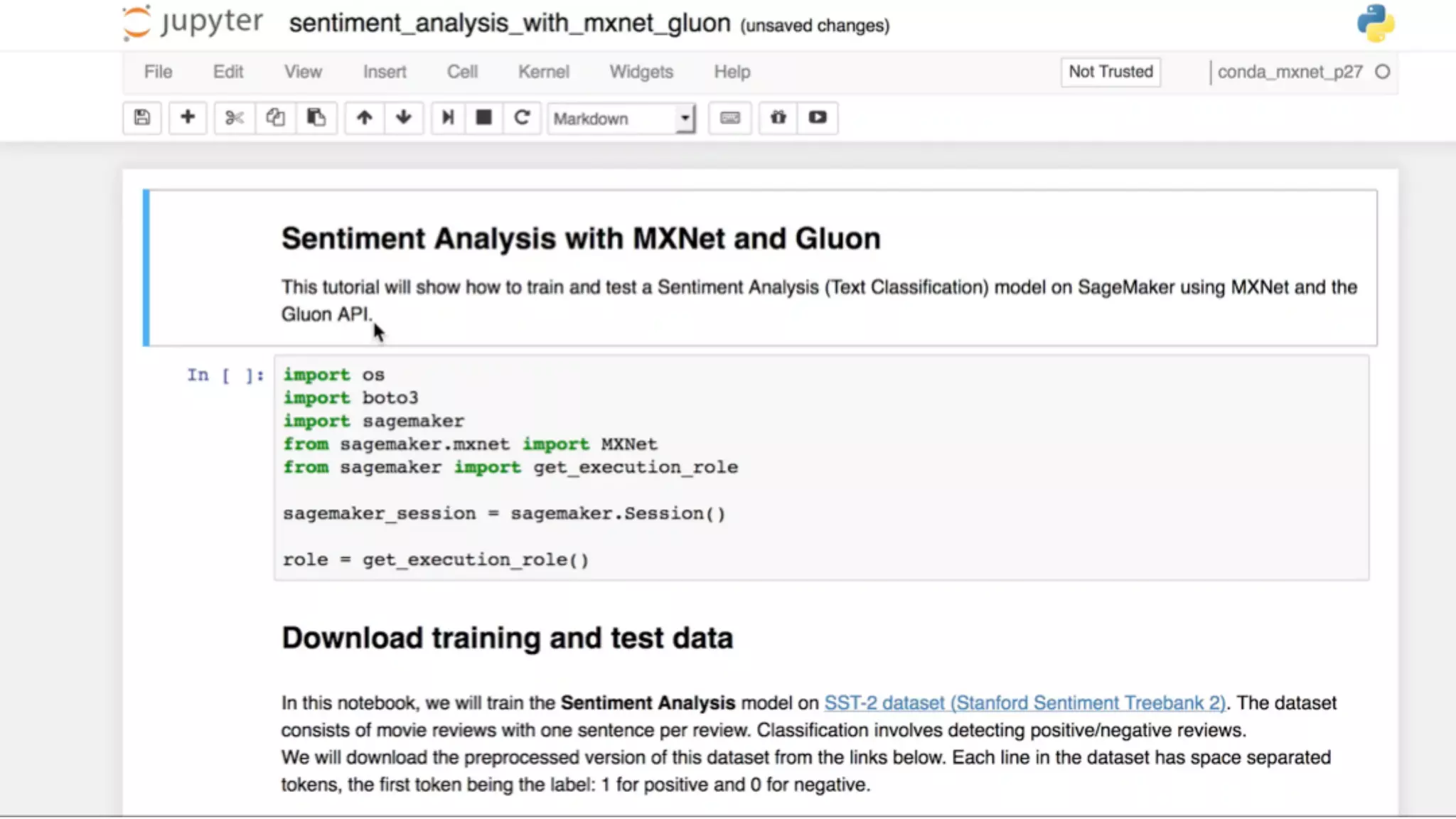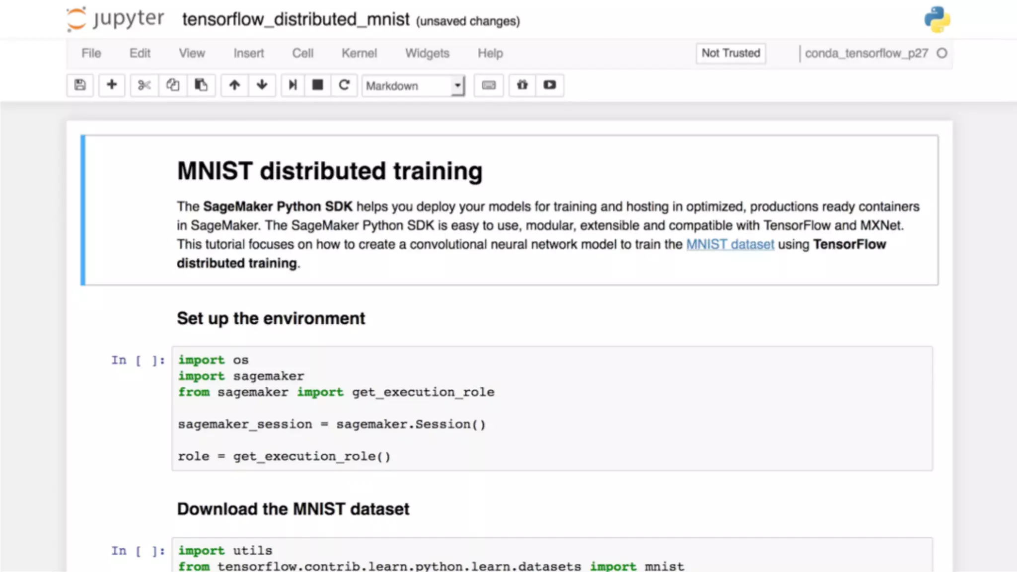 The document provides an overview of Amazon Web Services (AWS) related to deep learning, specifically detailing various machine learning frameworks, instance types, and their capabilities. It highlights the use of Amazon SageMaker for building, training, and deploying machine learning models, including code examples and the advantages of utilizing AWS for AI initiatives. Furthermore, it emphasizes collaborations and statements from industry leaders about leveraging AWS for scalable AI and machine learning solutions.