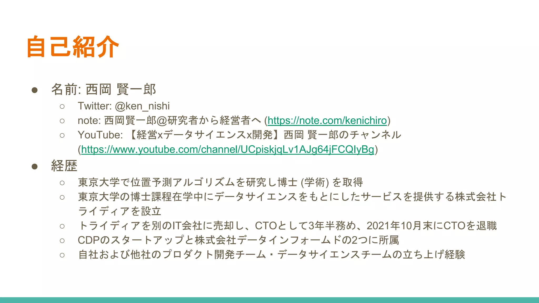 賢一郎 ○ Twitter: @ken_nishi ○ note: 西岡賢一郎@研究者から経営者へ (https://note.com/kenichiro) ○ YouTube: 【経営xデータサイエンスx開発】西岡 賢一郎のチャンネル (https://www.youtube.com/channel/UCpiskjqLv1AJg64jFCQIyBg) ● 経歴 ○ 東京大学で位置予測アルゴリズムを研究し博士 (学術) を取得 ○ 東京大学の博士課程在学中にデータサイエンスをもとにしたサービスを提供する株式会社ト ライディアを設立 ○ トライディアを別のIT会社に売却し、CTOとして3年半務め、2021年10月末にCTOを退職 ○ CDPのスタートアップと株式会社データインフォームドの2つに所属 ○ 自社および他社のプロダクト開発チーム・データサイエンスチームの立ち上げ経験