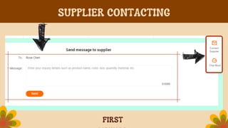 This document discusses product sourcing, including finding suppliers through online marketplaces, trade shows, or agencies. It covers considerations like minimum order quantities, pricing terms (EXW, FOB, DDP), and factors for evaluating suppliers like price, production time, experience, reviews. The steps outlined are to search keyword, click Buy Central, find and submit a Request for Quotation, create an RFQ, and receive supplier messages and quotations.