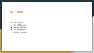 The document introduces Amazon Virtual Private Cloud (VPC), highlighting its importance in security and data access within AWS. It covers key concepts such as subnets, route tables, and security measures, as well as the architecture of VPC components like gateways and access control lists. Best practices for securing and managing a VPC, including routing configuration and regular audits, are also discussed.