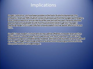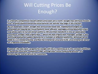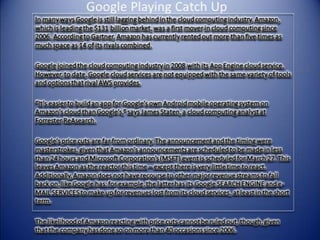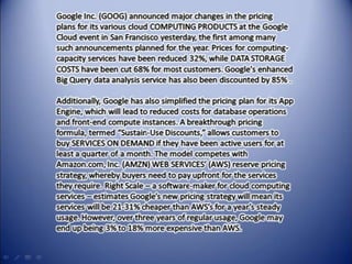 Google Inc.(GOOG) has announced significant cuts in its cloud services price plans in an attempt to compete with industry leader, Amazon.com, Inc. (AMZN)