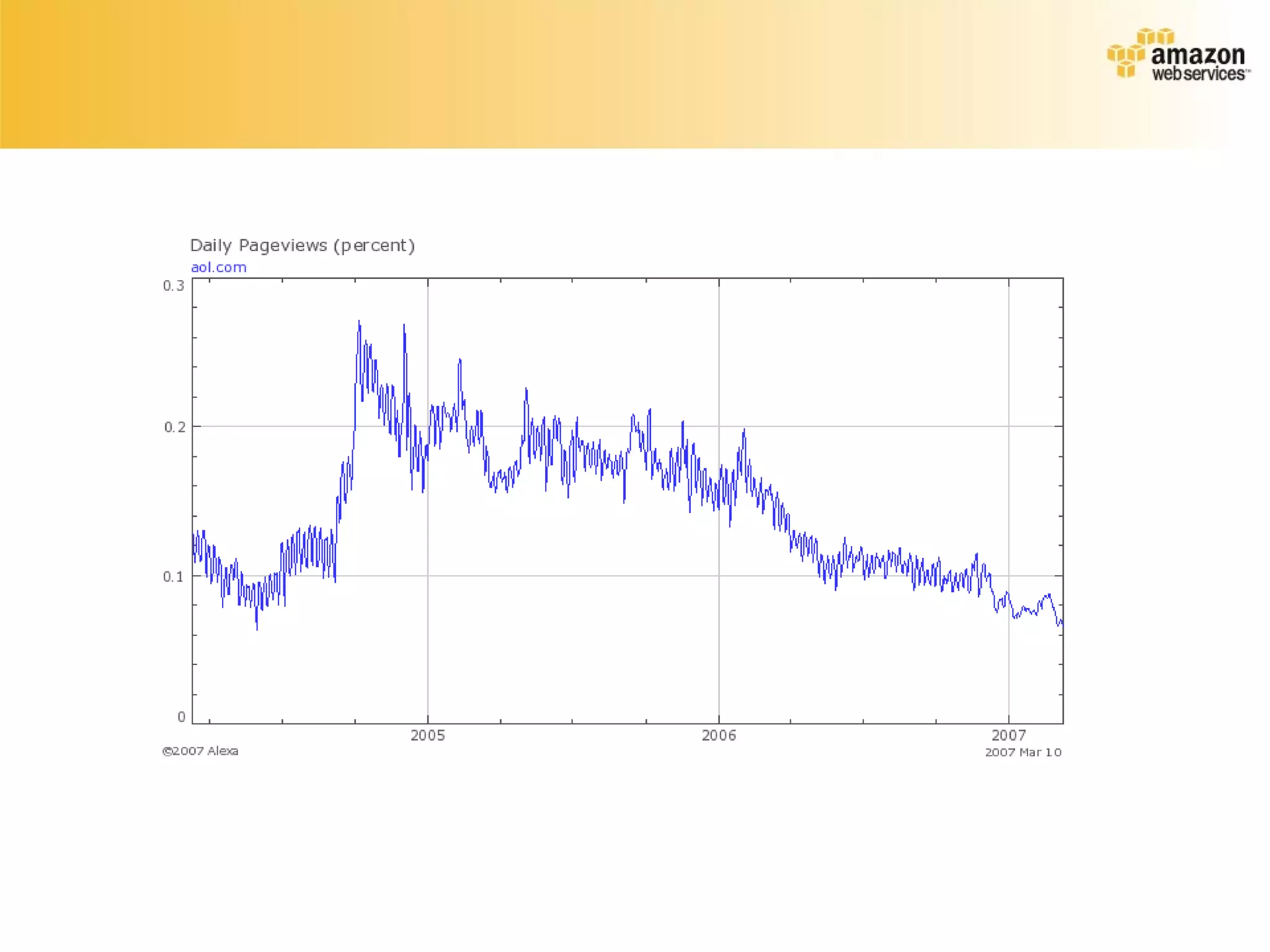 This document provides an overview of web scale computing and summarizes several Amazon Web Services (AWS) products that enable web scale infrastructure and applications. The AWS services discussed include Amazon Simple Storage Service (S3) for data storage, Amazon Elastic Compute Cloud (EC2) for scalable computing power, Amazon Mechanical Turk for distributed human intelligence tasks, Amazon Simple Queue Service for reliable messaging, and Alexa Web Services which provide access to web data and search capabilities. These services aim to reduce costs and improve scalability for developers building web scale applications and infrastructure.