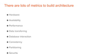 This document discusses several architecture patterns for building systems on Amazon Web Services (AWS). It outlines patterns for snapshotting data, scaling servers vertically and horizontally, using elastic block storage, distributing applications across multiple availability zones and regions, implementing load balancing and caching, and configuring databases and networking. Both benefits and cautions are provided for each pattern to help architects design resilient and secure systems on AWS.