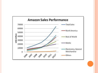 This document provides an overview of Amazon, the multinational e-commerce company founded by Jeff Bezos in 1994. It discusses Amazon's introduction as an online bookstore, its current status as one of the largest online retailers in the world with a focus on books, movies, music and various other products. The document also briefly outlines Amazon's business model, technology infrastructure, competitive strategies and opportunities for further growth.