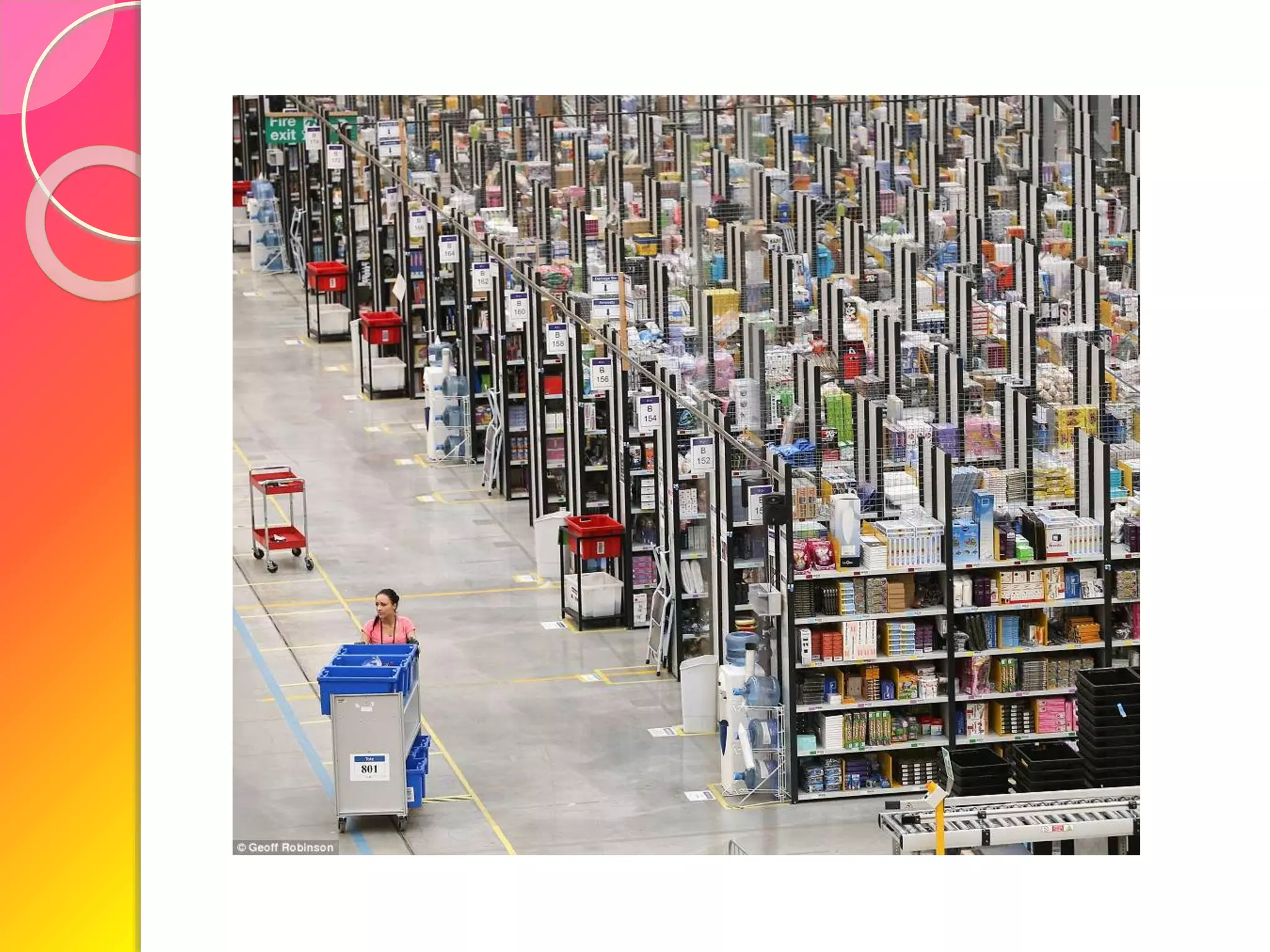 Amazon operates a large global supply chain network to support its e-commerce business. It has around 50 warehouses globally, including 20 in the US, to store and fulfill customer orders. Amazon uses a mix of in-house inventory and third-party suppliers to stock products. It aims to deliver most items within one day of ordering to stay competitive. Amazon's supply chain is designed for cost-effectiveness and responsiveness to meet high customer service levels and the wide range of customer demand.