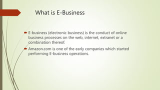 Amazon began as an online bookseller in 1994 and has since expanded to sell a wide variety of products online. It pioneered the long tail business model by offering many niche products and has no storage costs by directly connecting buyers and sellers. Amazon uses fulfillment centers to pick, pack, and ship orders for both its own products and those sold by third-party sellers using their Fulfillment by Amazon program. It maintains high customer value through a wide selection, availability of products, competitive pricing, and a positive customer experience supported by services like returns.