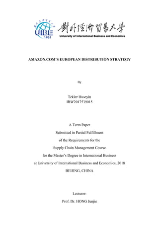 The document reviews Amazon.com's European distribution strategy, detailing its supply chain management and challenges compared to its U.S. operations. Despite successfully entering the European market, Amazon faced significant regulatory and operational hurdles, necessitating a strategic overhaul to integrate its European sites effectively. Recommendations include developing a centralized European supply chain, strengthening procurement teams, and enhancing the use of electronic data interchange (EDI) for improved efficiency.