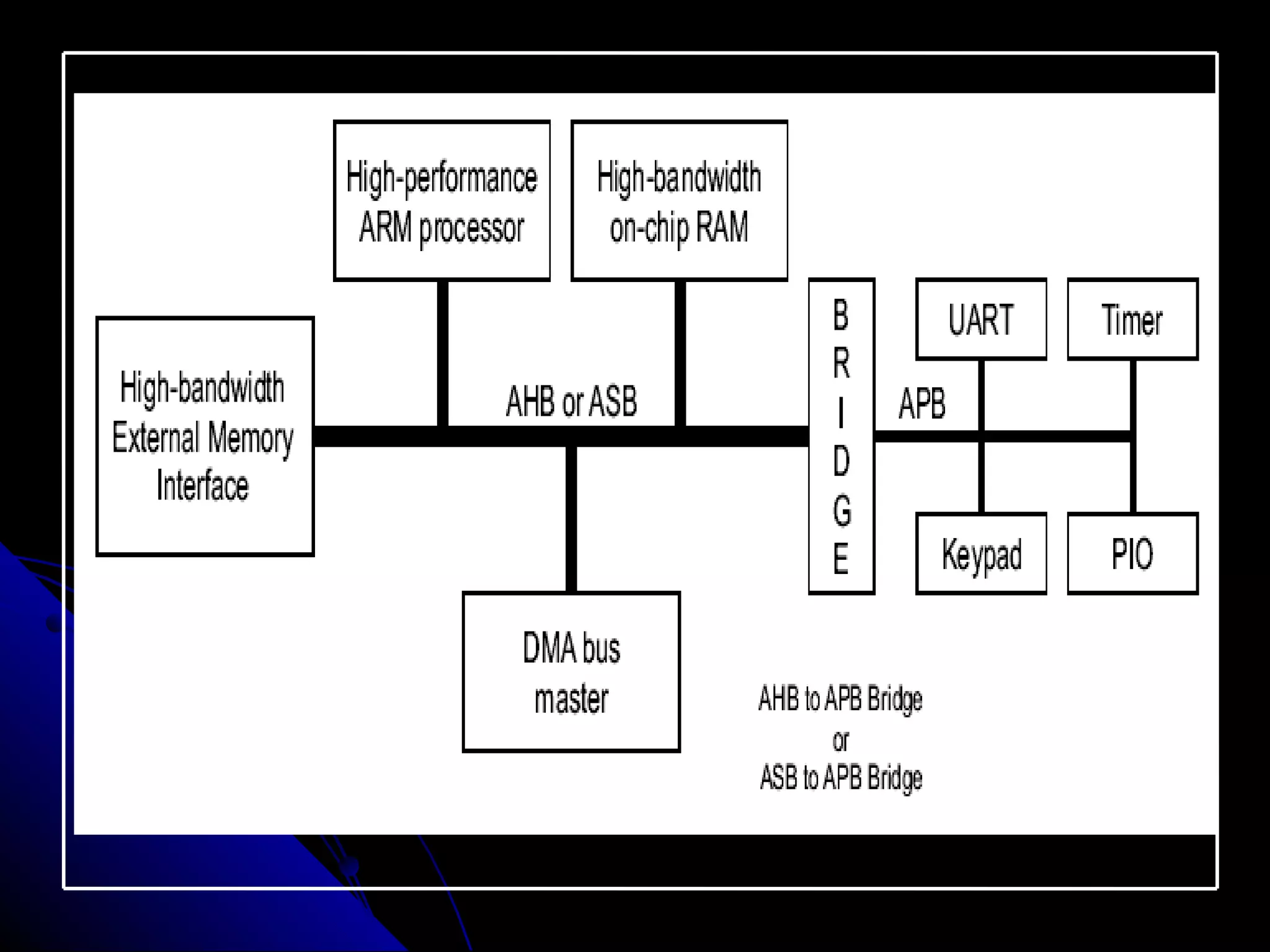 The AMBA specification defines standards for on-chip communication in microcontrollers. It includes three bus standards: Advanced High-performance Bus (AHB) for high bandwidth communication, Advanced System Bus (ASB) and Advanced Peripheral Bus (APB) for lower bandwidth peripherals. The objectives are to facilitate right-first-time development, be technology independent, encourage modular design, and minimize infrastructure. A typical system has the CPU and memory on the high-performance AHB, with peripherals on the lower-bandwidth APB, connected via a bridge.