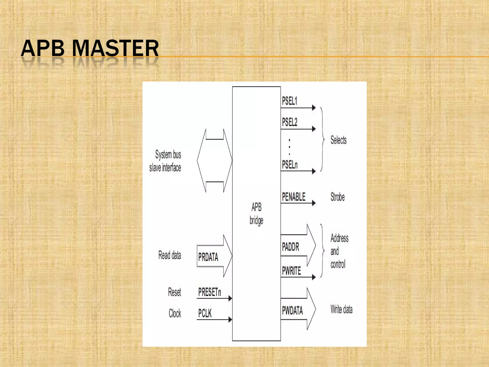 2. The APB bridge acts as the bus master, latching the address and controlling data transfer direction. It generates control signals to select the peripheral and indicate the transfer type (read/write).