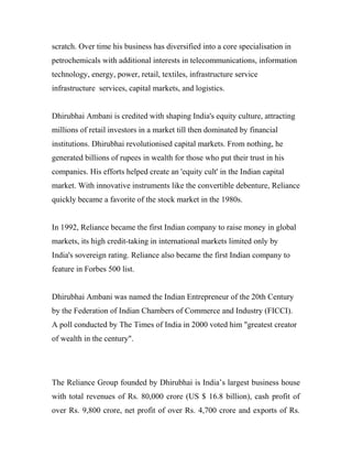 Dhirubhai Ambani was an Indian businessman who founded Reliance Industries, one of India's largest private sector companies. He started his career selling snacks and later worked as a clerk, saving money to start a textiles trading company. With his sons Mukesh and Anil, he built Reliance into a massive conglomerate with interests in petrochemicals, telecom, energy and more. Ambani transformed Indian markets by attracting millions of retail investors. He passed away in 2002, leaving behind a business empire but also questions about its future leadership and direction.
